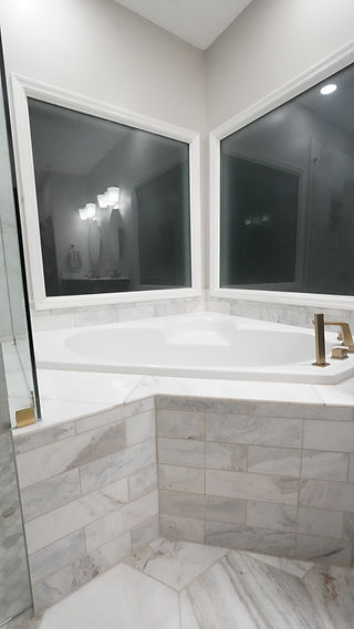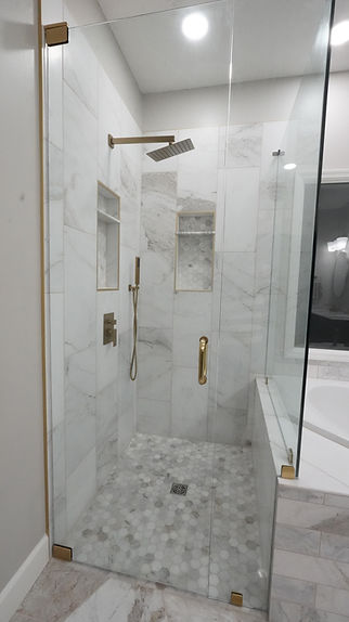 This beautiful bathroom is all natural stone. Brushed gold lighting and fixtures which complement the overall project. The double niche design is perfect for his and her while not being too invasive taking away from the elegance that makes this bathroom. This walk-in shower is curb less, which has become a modern highlight in many newly renovated bathrooms.